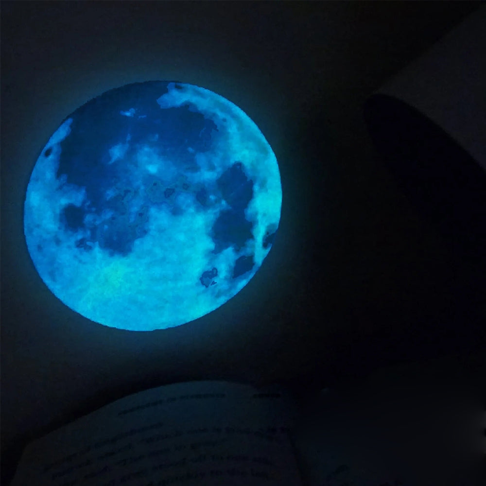 Sienos lipdukas - šviečiantis mėnulis. Lipdukas sugeria šviesą, todėl šviečia tamsoje (fluorescencinis). Puikiai tinka vaiko kambario dekoravimui (pvz., Ant lubų ir sienos). Lengvas montavimas ant bet kokio paviršiaus naudojant dvipusį lipduką.